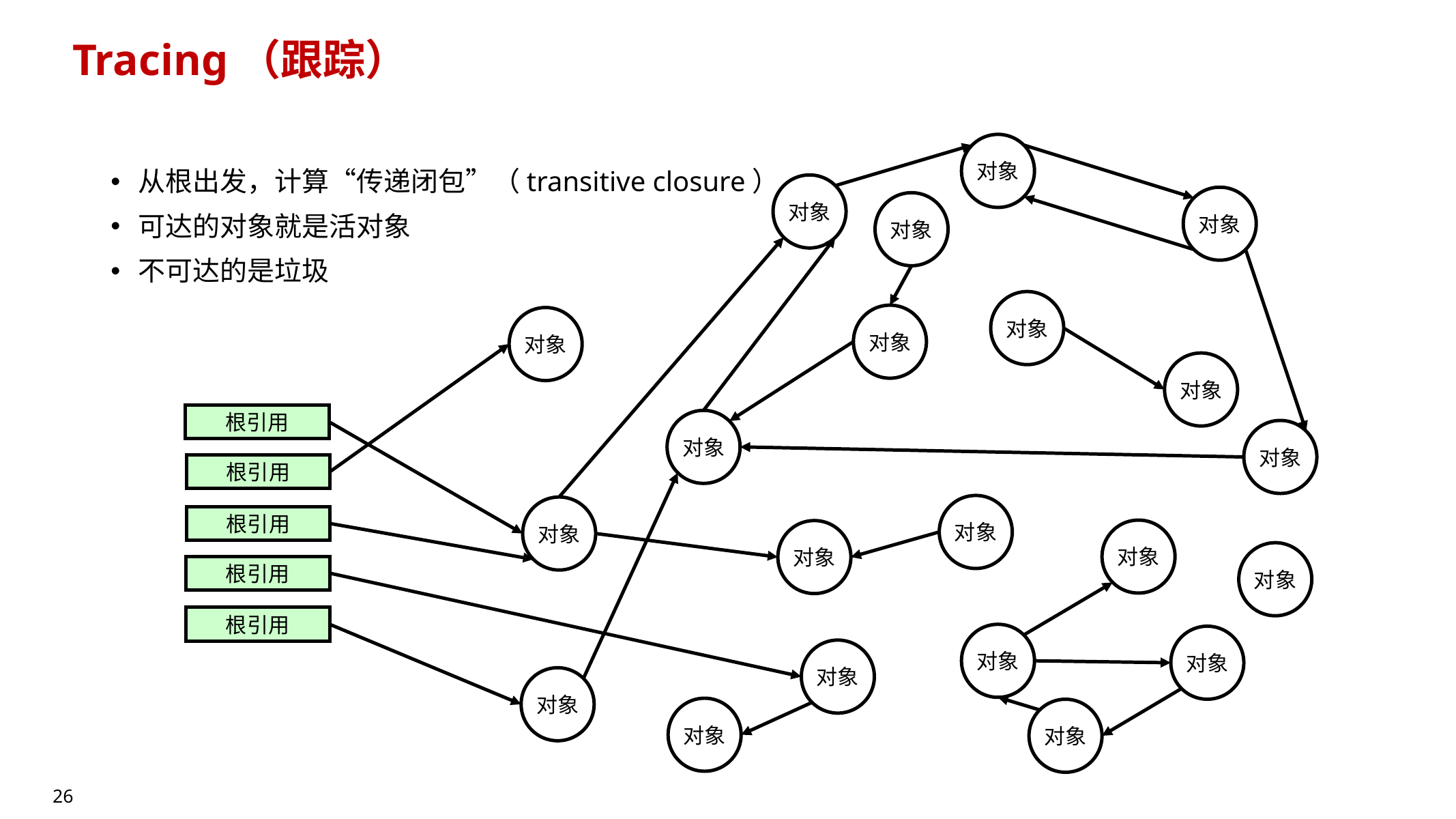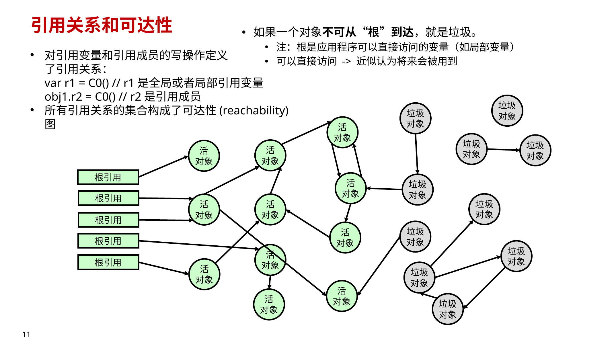 - 垃圾判定:从 root set 出发不可达 = 垃圾(reachability)