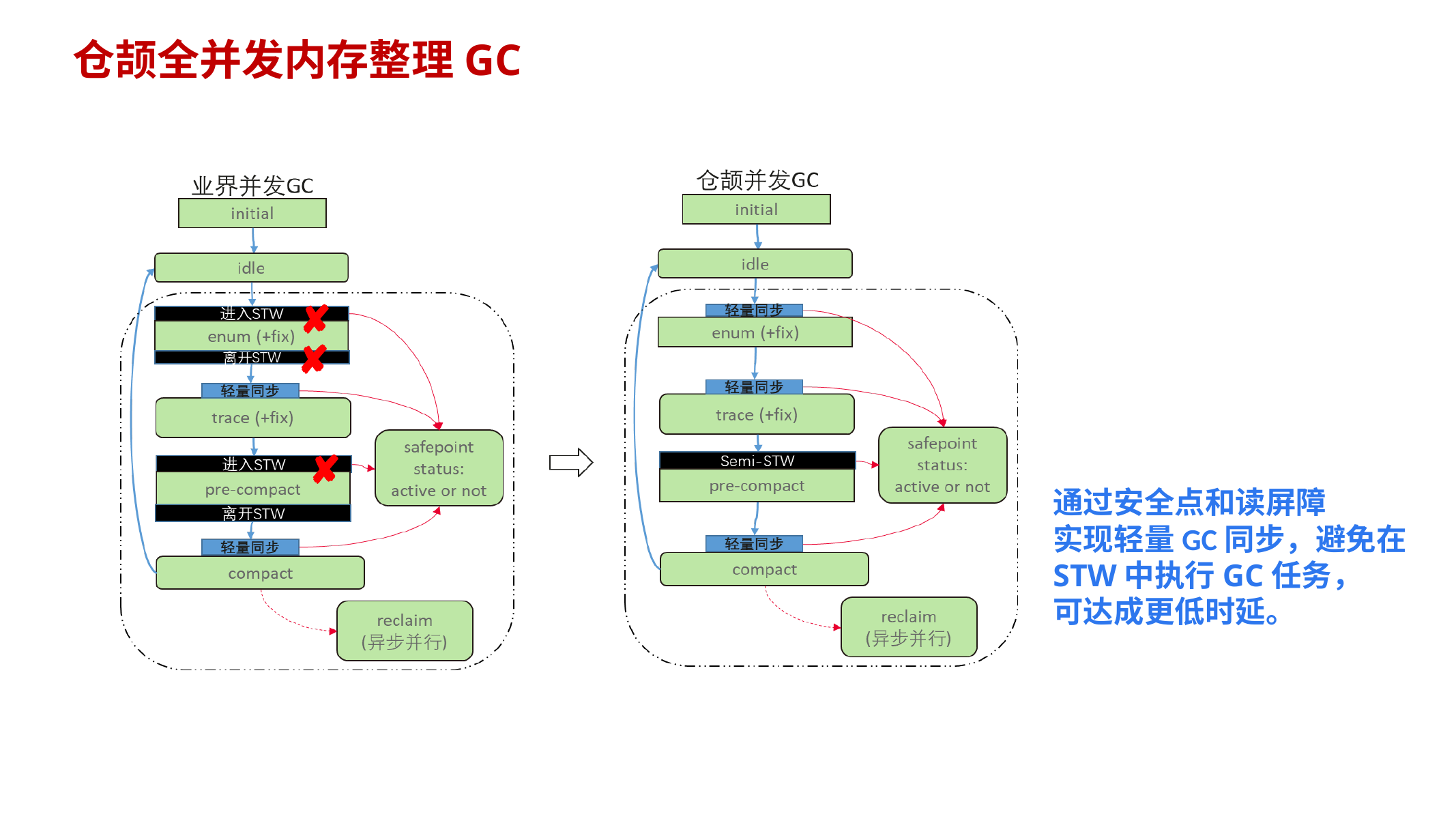 - 仓颉全并发整理:低延迟、低峰值;safepoint+读屏障;指针标记辅助修复